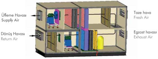 Nemi alınan hava karışım yapıldıktan sonra Heat-Pipe dst kısımdan ve kondenserden geçirilerek ısınmış halde mahale gönderilir. Taze hava kadar dönüş havası egzost edilir.