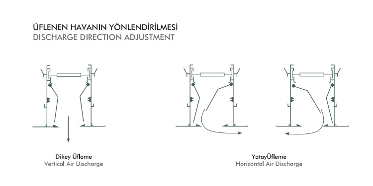 Yüksekliği 2,60 – 6 metreye kadar olan ortamlar için önerilir. Önerilen sıcaklık farkı -/+ 10 °C’ dir. Özel olarak haddelenmiş alüminyum profildendir. Kanatlar hariç, standart kaplama işlemi, RAL 9010 ve 9016 kodlu olan standart renklerle, elektrostatik toz boyama yöntemi ile yapılmaktadır. İsteğe bağlı olarak diğer renkler ve eloksal kaplama da yapılabilmektedir. Kanatlar ise siyah eloksal ile kaplanmaktadır. (Plenum kutusu) Optimum atış karakteristiğini sağlamak için difüzör arkasında kullanılır.